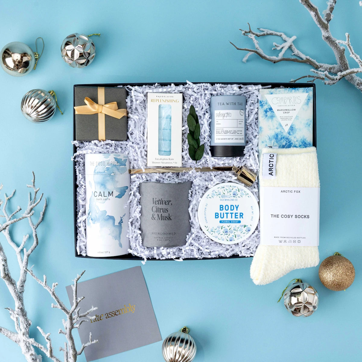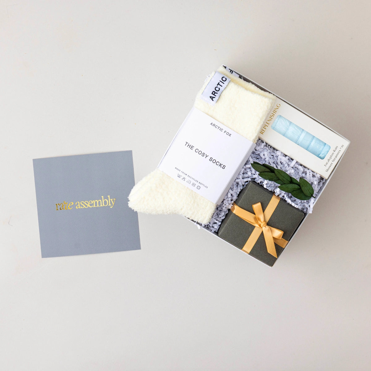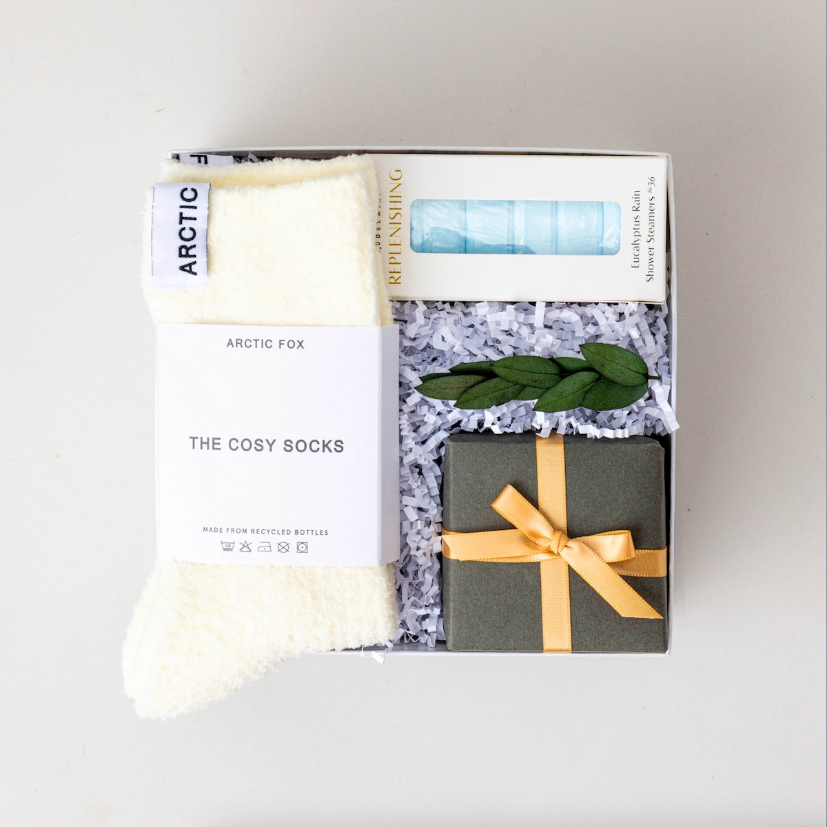 This set is a sleek, modern take on self-care gifts. Soft socks and soothing eucalyptus ...