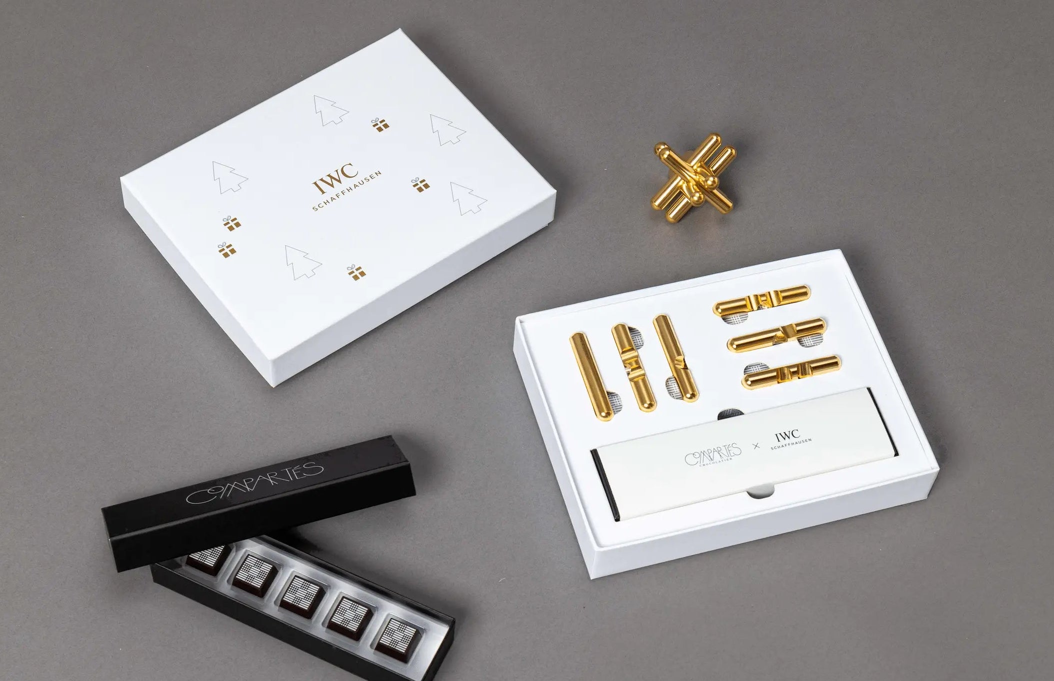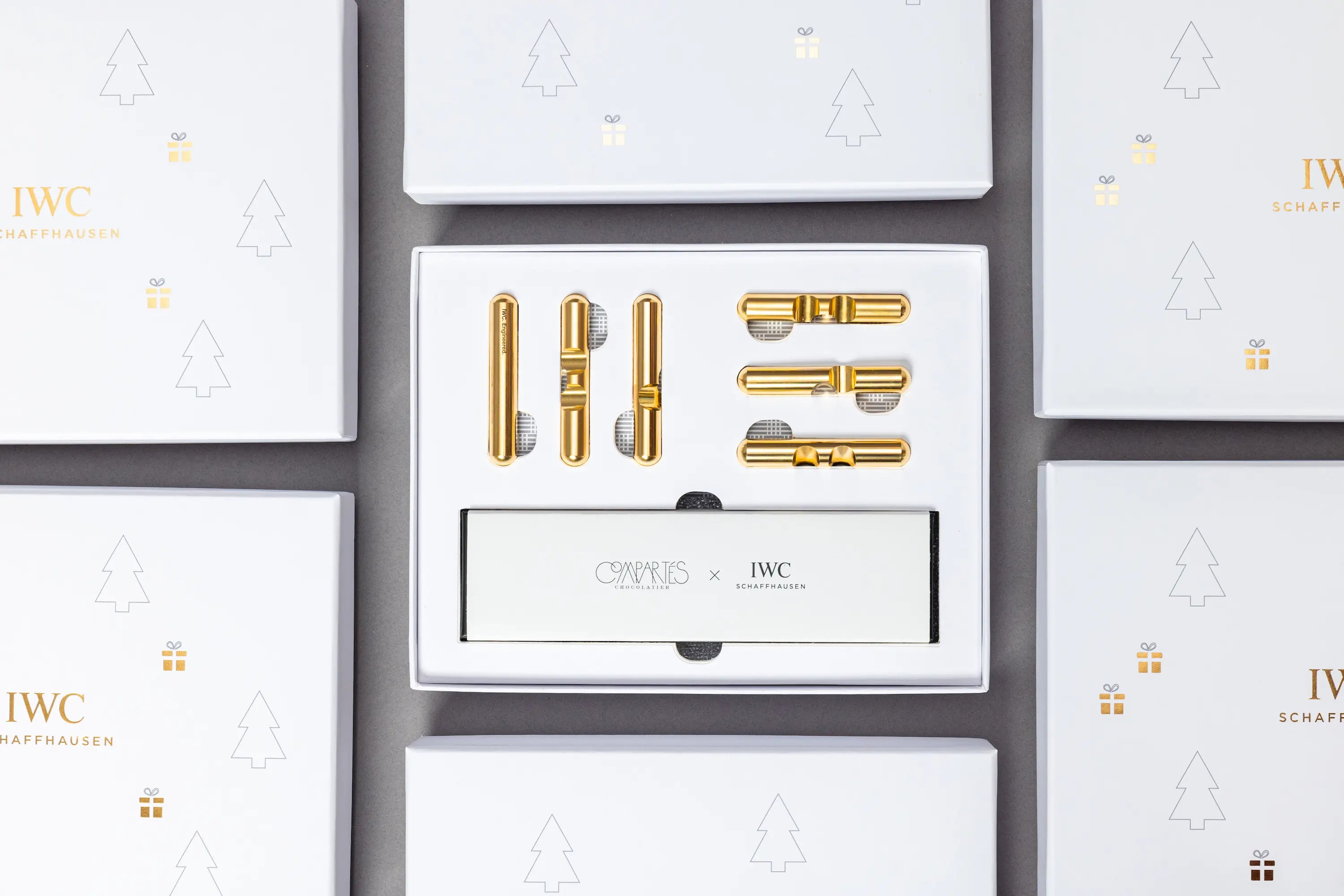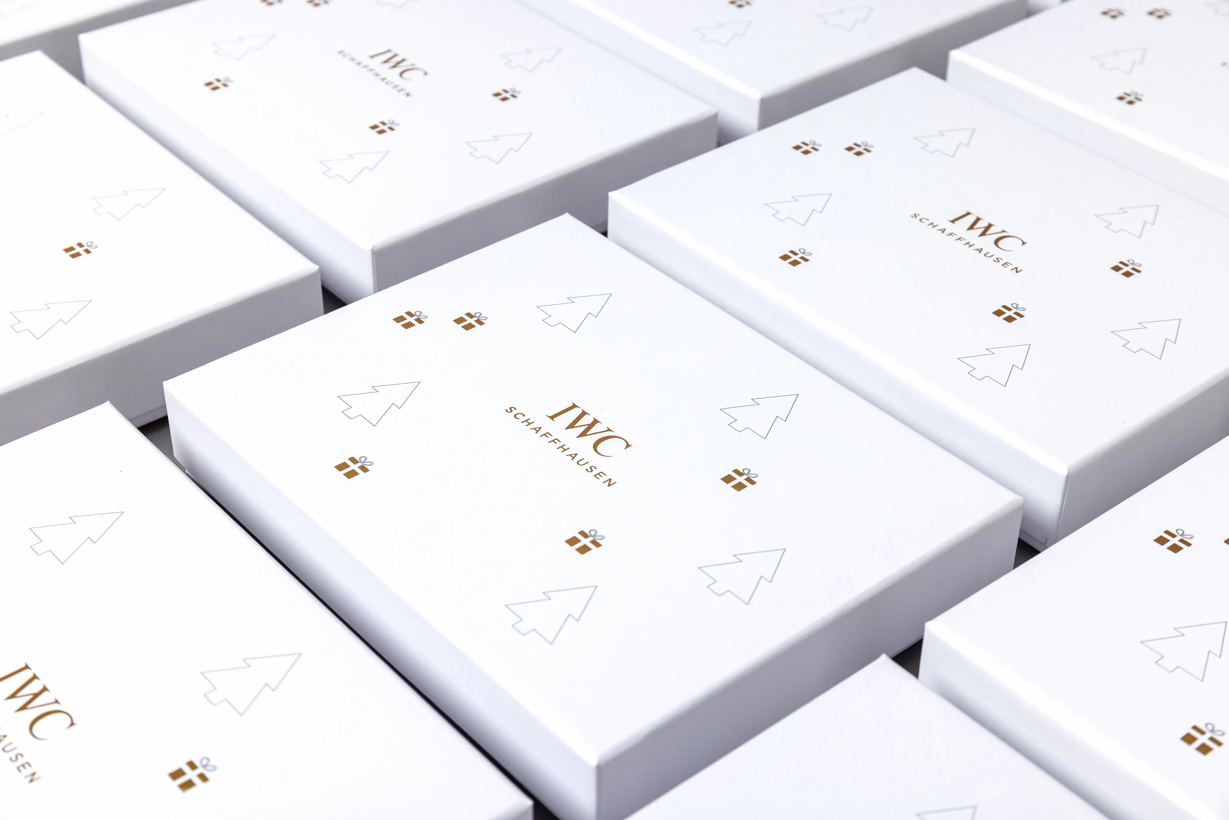 - Gold foil and ink detailing on the box lid, pulling from elements of IWC’s holiday cards