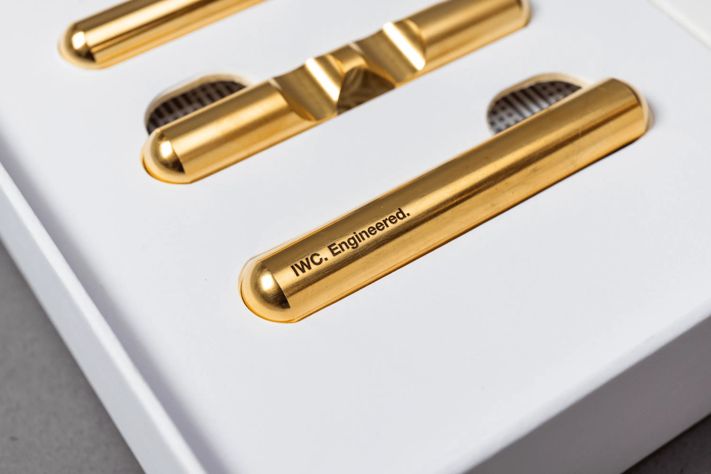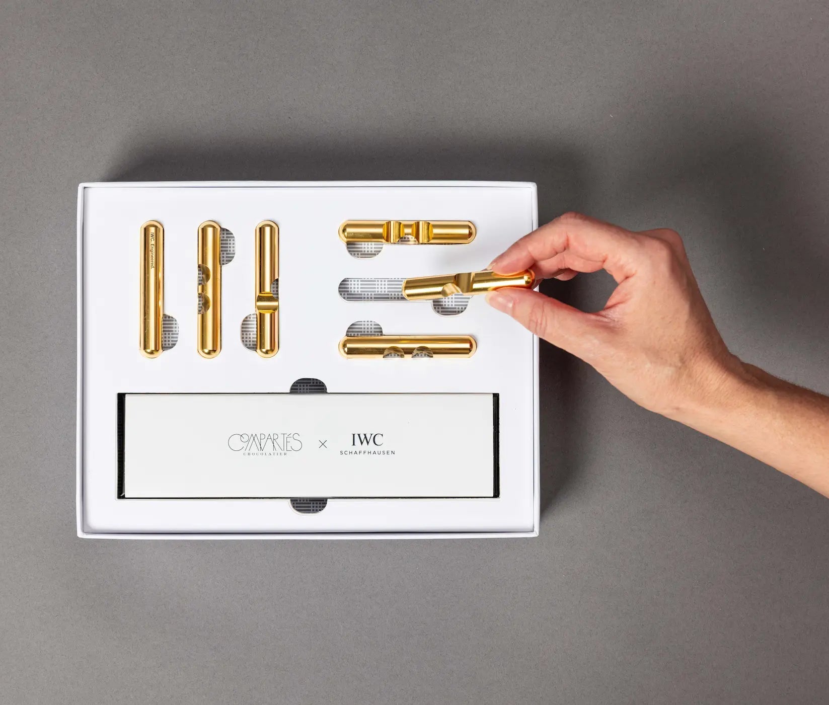 - A solid brass puzzle engraved with the IWC logo