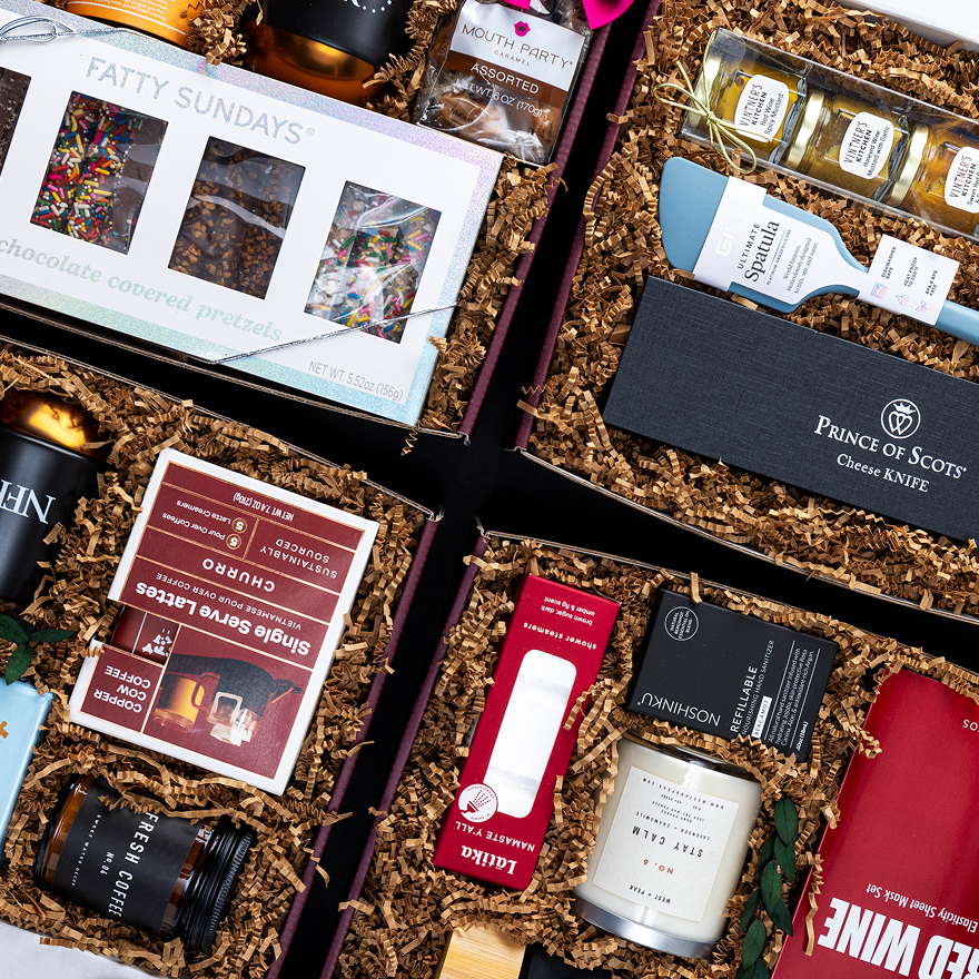 We created four distinct gift themes—The Self Care, The Home Cook, The Sweet Tooth, and The Coffee Lover—so employees could choose what suited them, while every box included a premium branded item and supporting gifts from small businesses. The process was streamlined through a custom GiftHub for easy selection and address collection.